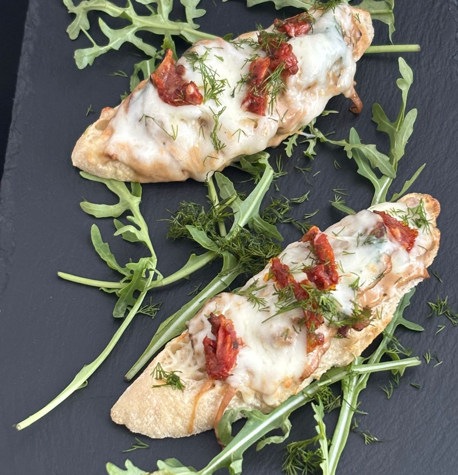 Ingrediente: 50 g – ciabatta, 10 g – salam picant, 10 g –cașcaval, 10 g – parmezan