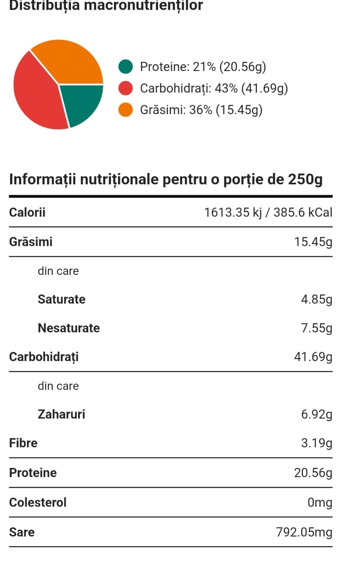 Ingrediente: 150g – cartofi dulci, 60g – orez sălbatic, 100g – brocoli, 110g – spanac, 20g – fistic, 140g – piept de pui